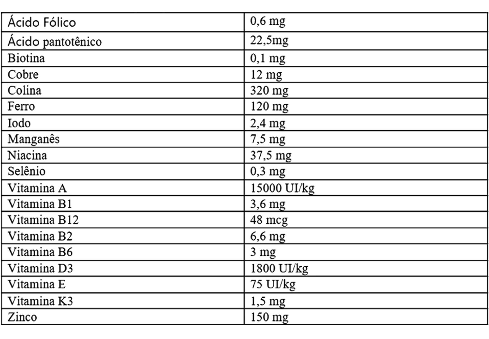 | MOS (Mananoligossacarídeos) (mín.) | 0,022% | Prebiótico: auxilia a flora intestinal e a imunidade. |