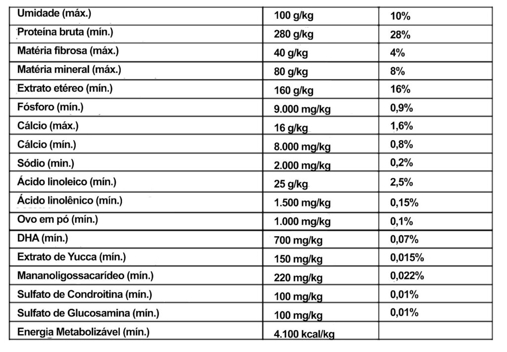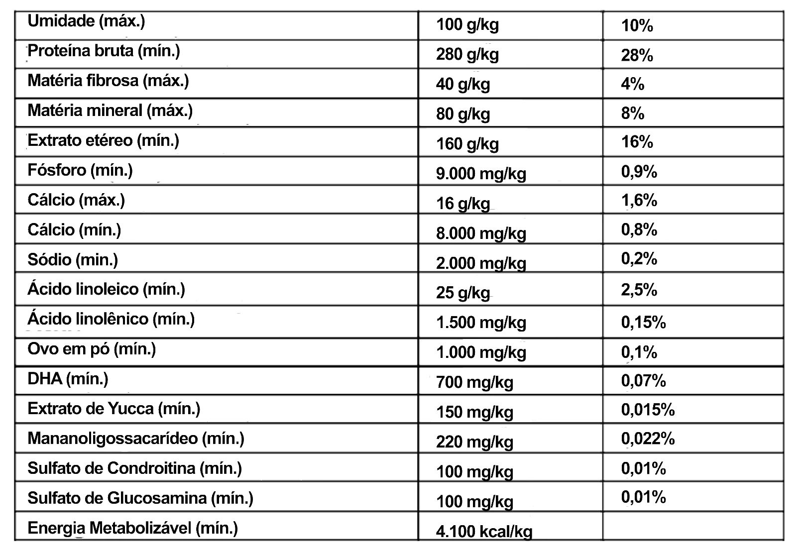 Farinha de vísceras de aves, Farinha de carne e ossos bovina, Quirera de arroz, Ovo em pó, Farelo de trigo, Milho moído*, Biomassa de microalgas desidratadas (Schizochytrium sp), Levedura de cervejaria inativada desidratada, Grão de linhaça, Polpa de beterraba desidratada, Gordura de frango, Hidrolisado de fígado de aves e suínos, Cloreto de sódio, Cloreto de potássio, Lignocelulose, Fosfato bicálcico, Sulfato de Condroitina, Sulfato de Glucosamina, Prebiótico (Mananoligossacarídeos), Ácido fólico, Biotina, Cloreto de colina, Niacina, Pantotenato de cálcio, Vitamina A, Vitamina D3 Vitamina E, Vitamina K3, Vitamina B1, Vitamina B2, Vitamina B6, Vitamina B12, Iodato de cálcio, Selenito de sódio, Sulfato de cobre, Sulfato de ferro, Sulfato de manganês, Sulfato de zinco, Extrato de yucca, Antioxidante (BHA/BHT), Ácido propiônico, Zeólita.